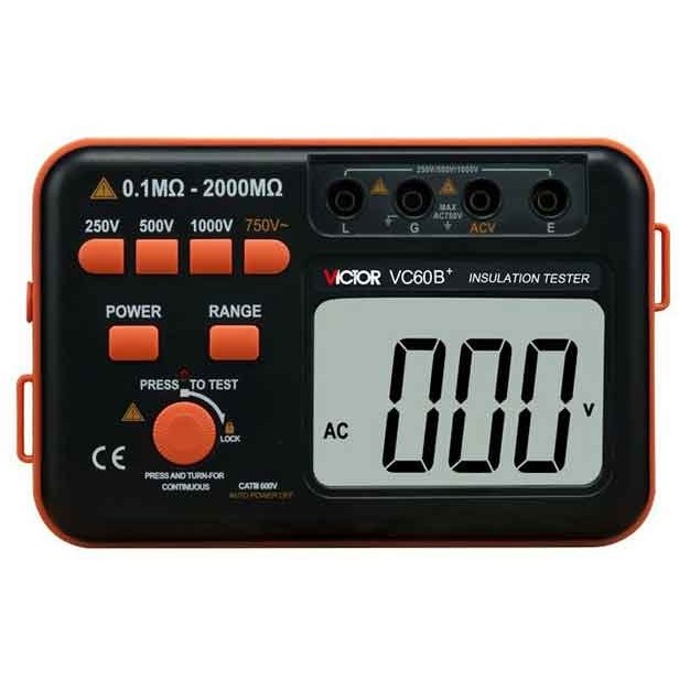 تستر مقاومت عایقی دیجیتال VC60B مدل 1000 ولت، تولید و عرضه شده توسط شرکت ویکتور چین، یک ابزار با قیمت مقرون به صرفه است. یکی از ویژگیهای برجسته این میگر، دارا بودن نشانگر هشدار دهنده خارج از رنج اهم در حالت دیجیتال است. همچنین، محدوده بیشینه اندازهگیری مقاومت عایقی آن برابر با 2000 مگااهم است. این دستگاه تستر مقاومت عایقی دیجیتال (VC60B+) دارای نگهدارنده مقادیر و سیستم خاموشی اتوماتیک است. همچنین، این دستگاه تستر عایقی دارای 4 رنج اندازهگیری ولتاژ (250/500/750/1000 ولت) میباشد.