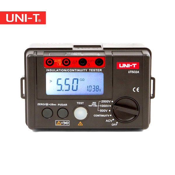 میگر 2.5 کیلو ولت یونیتی UT502A برای اندازه گیری مقاومت عایقی تجهیزات برقی و لوازم خانگی مورد استفاده قرار می گیرد. این کار با اندازه گیری مقاومت عایق بین مدارهای الکتریکی یا بین مدارها و زمین انجام می شود. سری UT500 کمپانی یونیتی می تواند مقاومت عایق، ولتاژ AC، مقاومت در رنج کم، PI (شاخص قطبی سازی) و DAR (جذب دی الکتریک) را اندازه گیری کند.